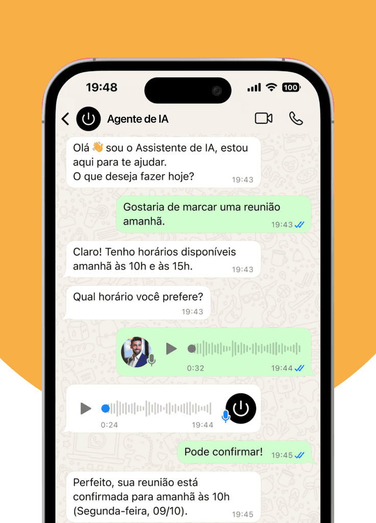 Conversa natural e humanizada em qualquer formato. Seu agente entende mensagens de texto ou áudio e responde de forma rápida, clara e personalizada.