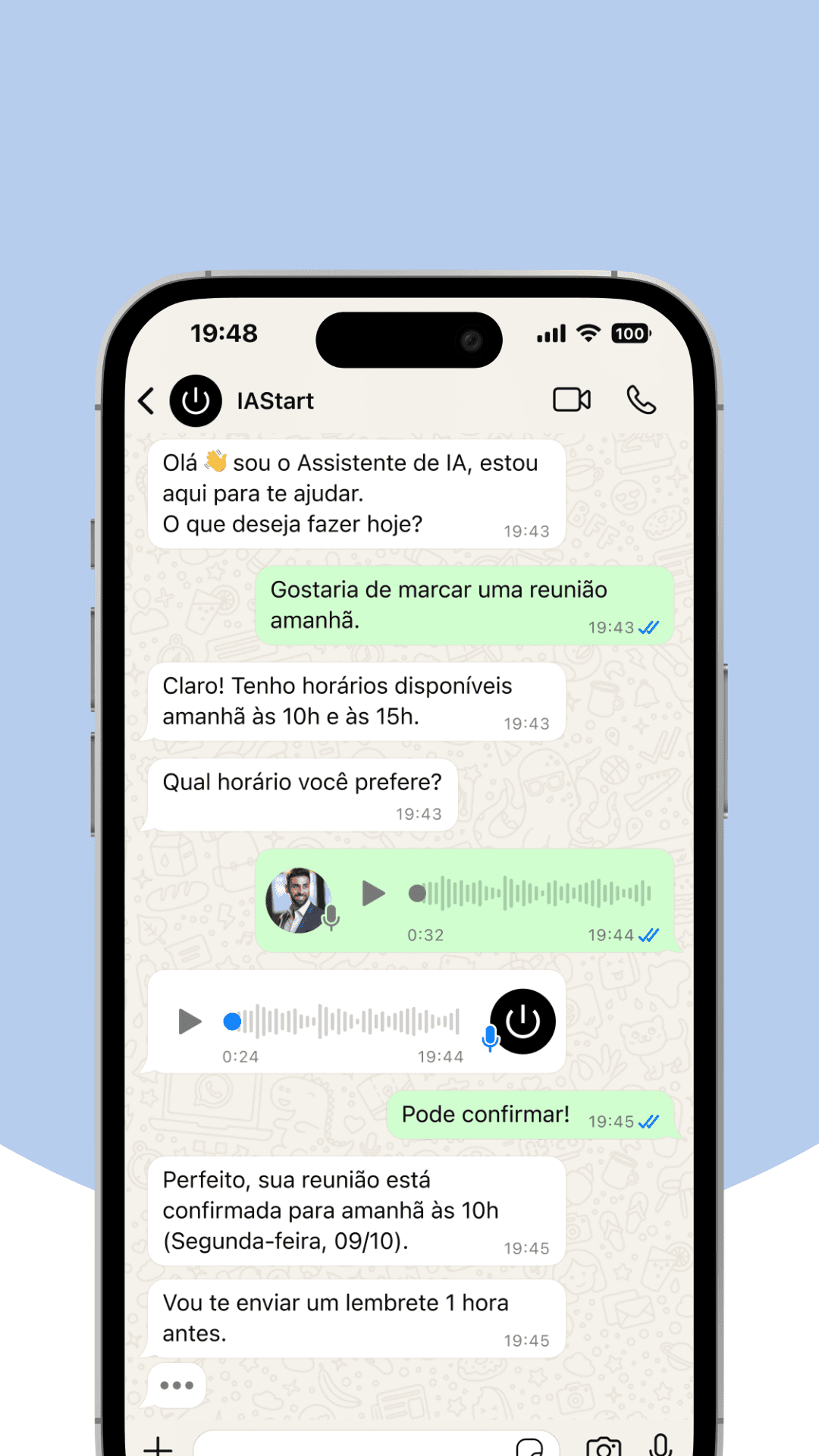 O cliente manda áudio, o agente entende. Manda texto, o agente responde na hora — com naturalidade, sem parecer robô, pois este mesmo agente está sendo treinado há mais de um ano.